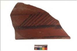 | Description / विवरण | Specimen of black on red ware with black decorative broad horizontal and vertical lines geometric painting . |