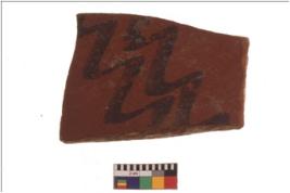 | Description / विवरण | Specimen of black on red ware with black decorative wavy lines geometric painting . |