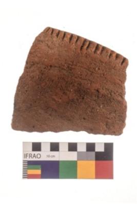 | Description / विवरण | Specimen of red ware with decorative incisions Vertical lines at the rim . |