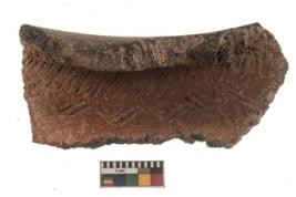 | Description / विवरण | Specimen of red ware with decorative Engraved slanting lines joint to zigzag lines below incisions. |