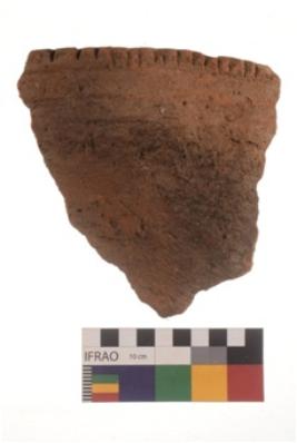 | Description / विवरण | Specimen of red ware with decorative incisions Vertical parallel lines at the rim . |