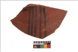 | Description / विवरण | Specimen of black on red ware with black decorative vertical lines geometric painting . |