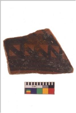 | Description / विवरण | Specimen of black on red ware with black decorative broad horizontal lines and intersecting wavy lines geometric painting . |