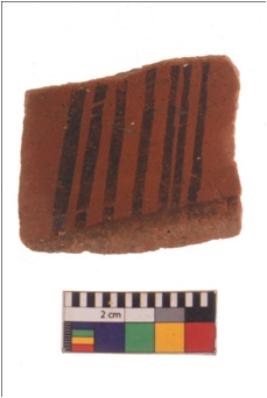 | Description / विवरण | Specimen of black on red ware with black decorative vertical lines geometric painting . |
