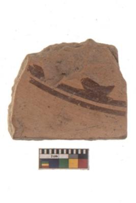 | Description / विवरण | Specimen of black on red ware with black decorative Horizontal lines with projecting circles geometric painting. |