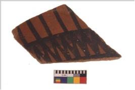 | Description / विवरण | Specimen of black on red ware with black decorative broad horizontal lines and intersecting wavy lines geometric painting . |
