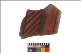 | Description / विवरण | Specimen of black on red ware with black decorative broad horizontal and vertical slanting lines geometric painting . |