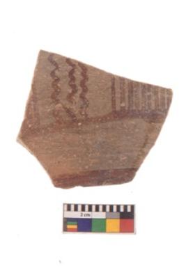 | Description / विवरण | Specimen of red on red ware with decorative Vertical wavy lines parallel to vertical lines geometric painting. |