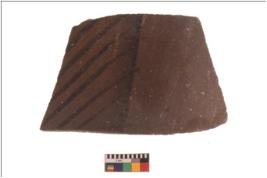 | Description / विवरण | Specimen of black on red ware with black decorative vertical slanting lines geometric painting . |