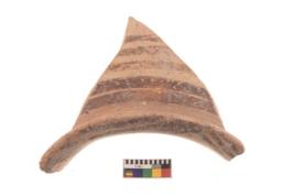 | Description / विवरण | Specimen of black on red ware with black decorative Parallel lines and criss cross pattern on the rim geometric painting. |