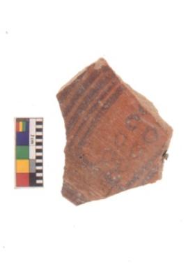 | Description / विवरण | Specimen of black on red ware with black decorative Horizontal lines with small dots below geometric painting. |