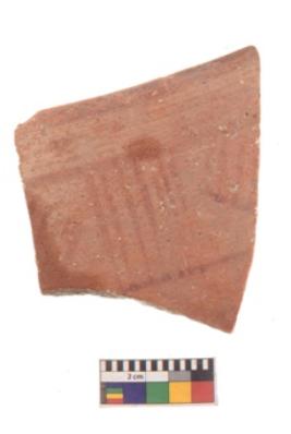 | Description / विवरण | Specimen of black on red ware with black decorative Band of horizontal lines with vertical lines in between geometric painting. |