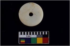 | Description / विवरण | Specimen of a disc circular shaped bead It is having flat surface and smooth edge,It is white in colour with center perforation. |