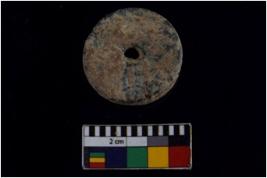 | Description / विवरण | Specimen of a disc circular shaped bead It is having flat surface and smooth edge,It is black in colour with center perforation. |