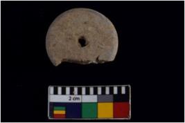 | Description / विवरण | Specimen of a partially broken disc circular shaped bead It is having flat surface and smooth edge,It is black in colour with center perforation. |