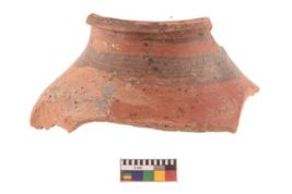 | Description / विवरण | Specimen of black on red ware with black decorative Bands of horizontal lines geometric painting. |