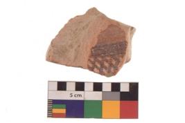 | Description / विवरण | Specimen of black on red ware with black decorative Lattice pattern geometric painting. |