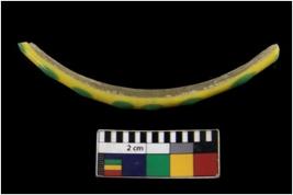 | Description / विवरण | Specimen of Bangle with circular cross section and smooth surface decorated with green dot design. |