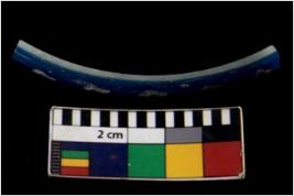 | Description / विवरण | Specimen of dark blue bangle with decoration of white dashes, circular cross section and smooth surface. |