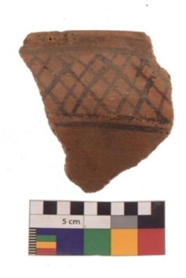 | Description / विवरण | Specimen of black on red ware with black decorative Lattice pattern geometric painting. |