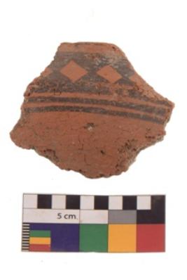 | Description / विवरण | Specimen of black on red ware with black decorative Joined diamond shaped motifs with horizontal lines below geometric painting. |