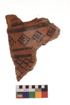 | Description / विवरण | Specimen of black on red ware with black decorative Horizontal bands with lattice diamond shaped motifs and latice pattern below geometric painting. |