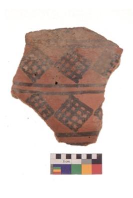 | Description / विवरण | Specimen of black on red ware with black decorative Horizontal bands with lattice diamond shaped motifs in between geometric painting. |