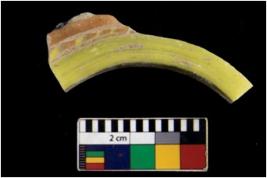 | Description / विवरण | Specimen of bangle with circular cross section and smooth surface. It has decorative multicolour bended lines. |