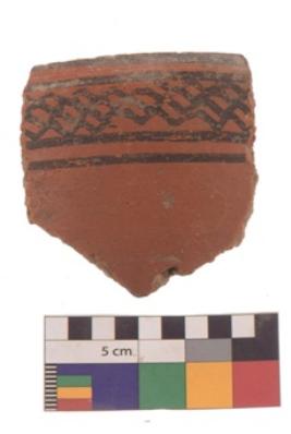 | Description / विवरण | Specimen of black on red ware with black decorative Horizontal lines with wavy lines in between geometric painting. |