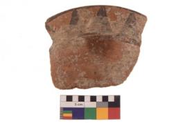 | Description / विवरण | Specimen of black on red ware with black decorative Joined triangles geometric painting. |