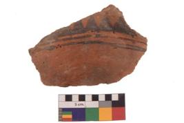 | Description / विवरण | Specimen of black on red ware with black decorative Horizontal lines with joined triangles above geometric painting. |