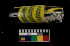 | Description / विवरण | Specimen of green bangle decorated yellow and light green color, circular cross section and smooth surface. |