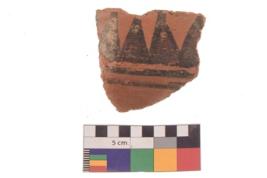 | Description / विवरण | Specimen of black on red ware with black decorative Joined triangles with horizontal lines below geometric painting. |
