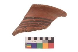 | Description / विवरण | Specimen of black on red ware with black decorative Horizontal lines geometric painting. |