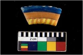 | Description / विवरण | Specimen of bangle with circular cross section and smooth surface. It has decorative multicolour bended lines. |