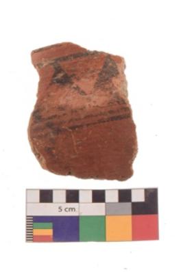 | Description / विवरण | Specimen of black on red ware with black decorative Horizontal lines with joined triangles above nature painting. |
