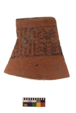 | Description / विवरण | Specimen of black on red ware with black decorative Horizontal band with vertical and wavy lines in between geometric painting. |