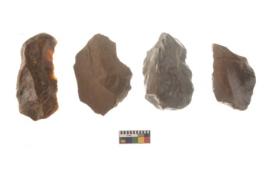 | Description / विवरण | There are n 4 flakes tool; there are flakes tool with prominent flaking marks. It made up of a large flakes with sides trimmed. |