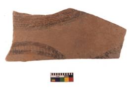 | Description / विवरण | Specimen of black on red ware with black decorative Joined cuvres with straitions in between geometric painting. |