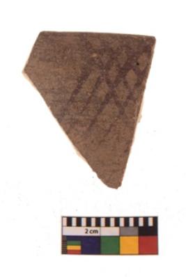 | Description / विवरण | Specimen of black on red ware with black decorative Mesh like pattern geometric painting. |