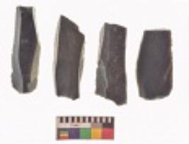 | Description / विवरण | There are n 4 utilized flake cores. There are multi directional irregular scar pattern on both dorsal and ventral face of the flake cores. Three are tapering at one end and one has sharp edge. |