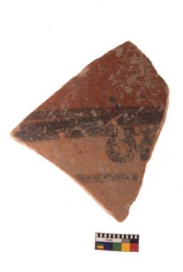 | Description / विवरण | Specimen of black on red ware with black decorative Horizontal lines with circles in between geometric painting. |