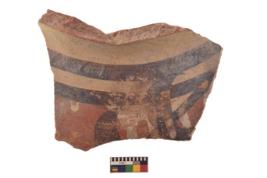 | Description / विवरण | Specimen of Potsherd black on red painted pottery. It is fine fabric in sharp contrast with painted design are executed in black pigment. |