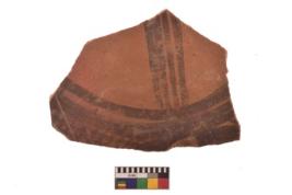 | Description / विवरण | Specimen of Potsherd black on red painted pottery. It is fine fabric in sharp contrast with painted design are executed in black pigment. |
