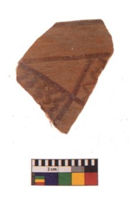 | Description / विवरण | Specimen of black on red ware with black decorative Cross pattern with attached wavy lines geometric and nature painting. |