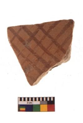 | Description / विवरण | Specimen of black on red ware with black decorative Lattice pattern geometric painting. |