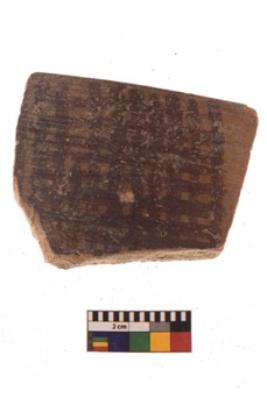 | Description / विवरण | Specimen of black on red ware with black decorative Mesh like pattern geometric painting. |