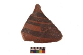 | Description / विवरण | Specimen of Potsherd black on red painted pottery. It is fine fabric in sharp contrast with painted design are executed in black pigment. |