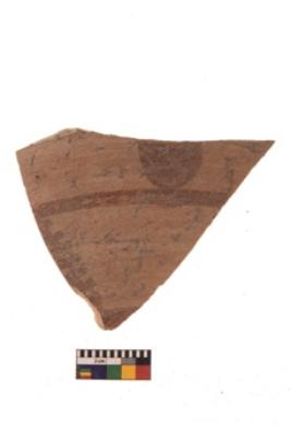 | Description / विवरण | Specimen of black on red ware with black decorative Circle with a horizontal line below geometric painting. |
