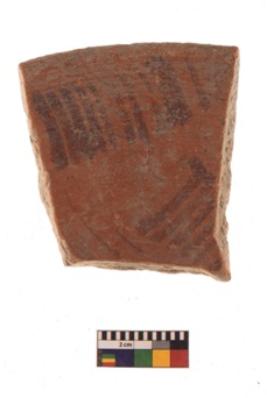 | Description / विवरण | Specimen of black on red ware with black decorative Vertical lines geometric painting. |